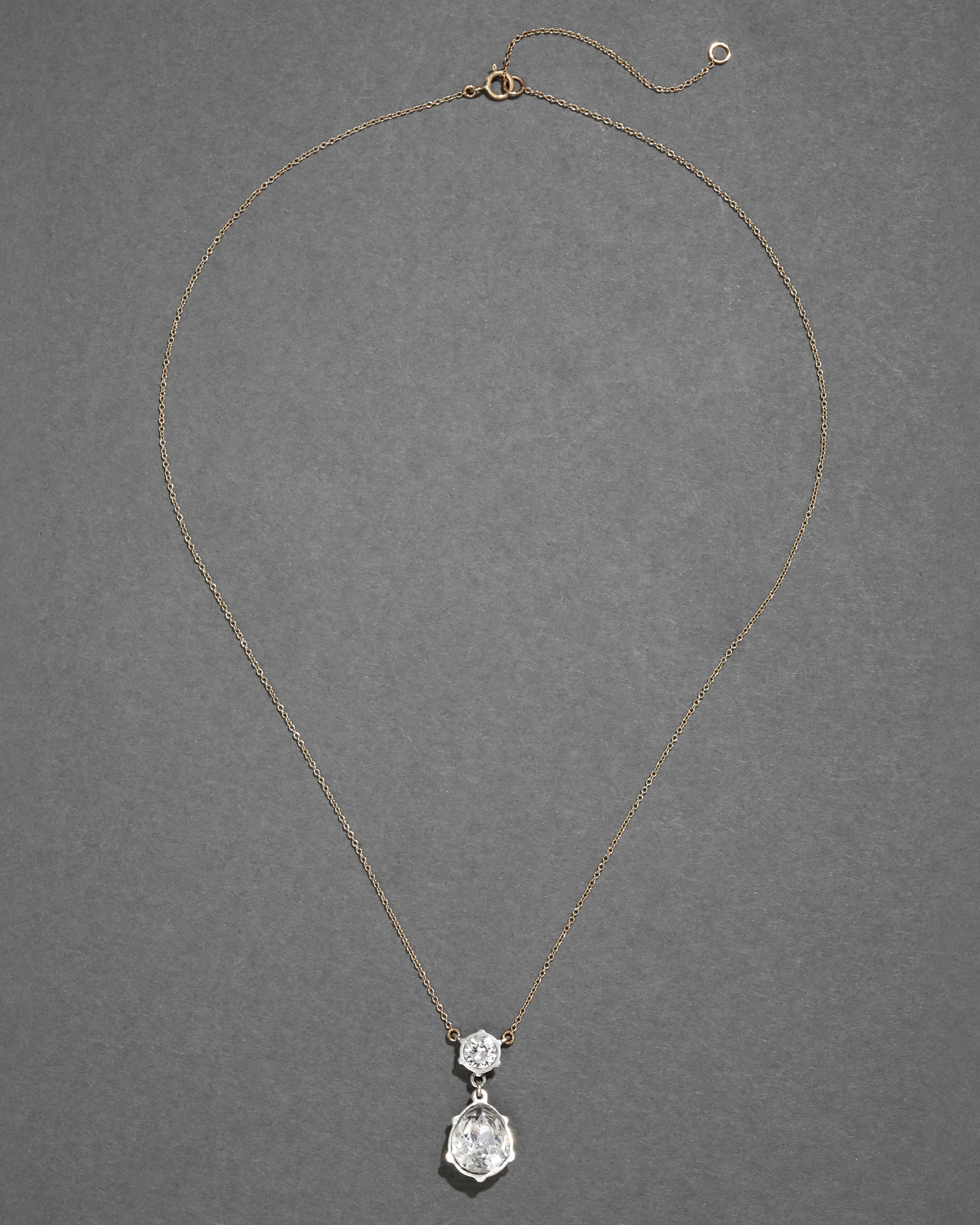 A luminous pear cut crystal is topped with a round cut crystal in sterling silver settings for a classic silhouette, on a delicate 14k gold chain.