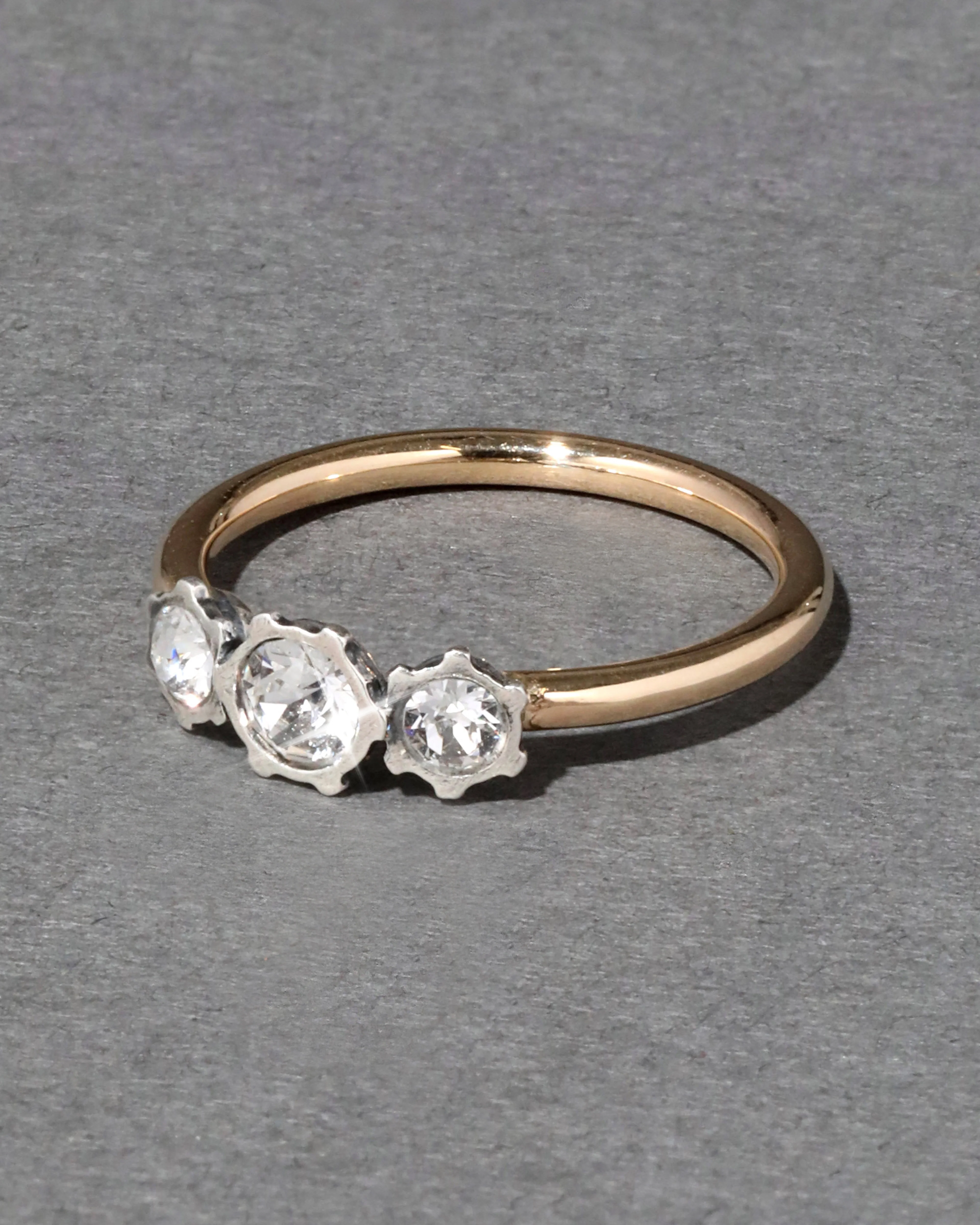 With brilliant shine, a delicate trio of graduated round cut luminous crystals are set in sterling silver on a round 14k gold band. Timeless in style this ring can be worn alone or stacked with others.