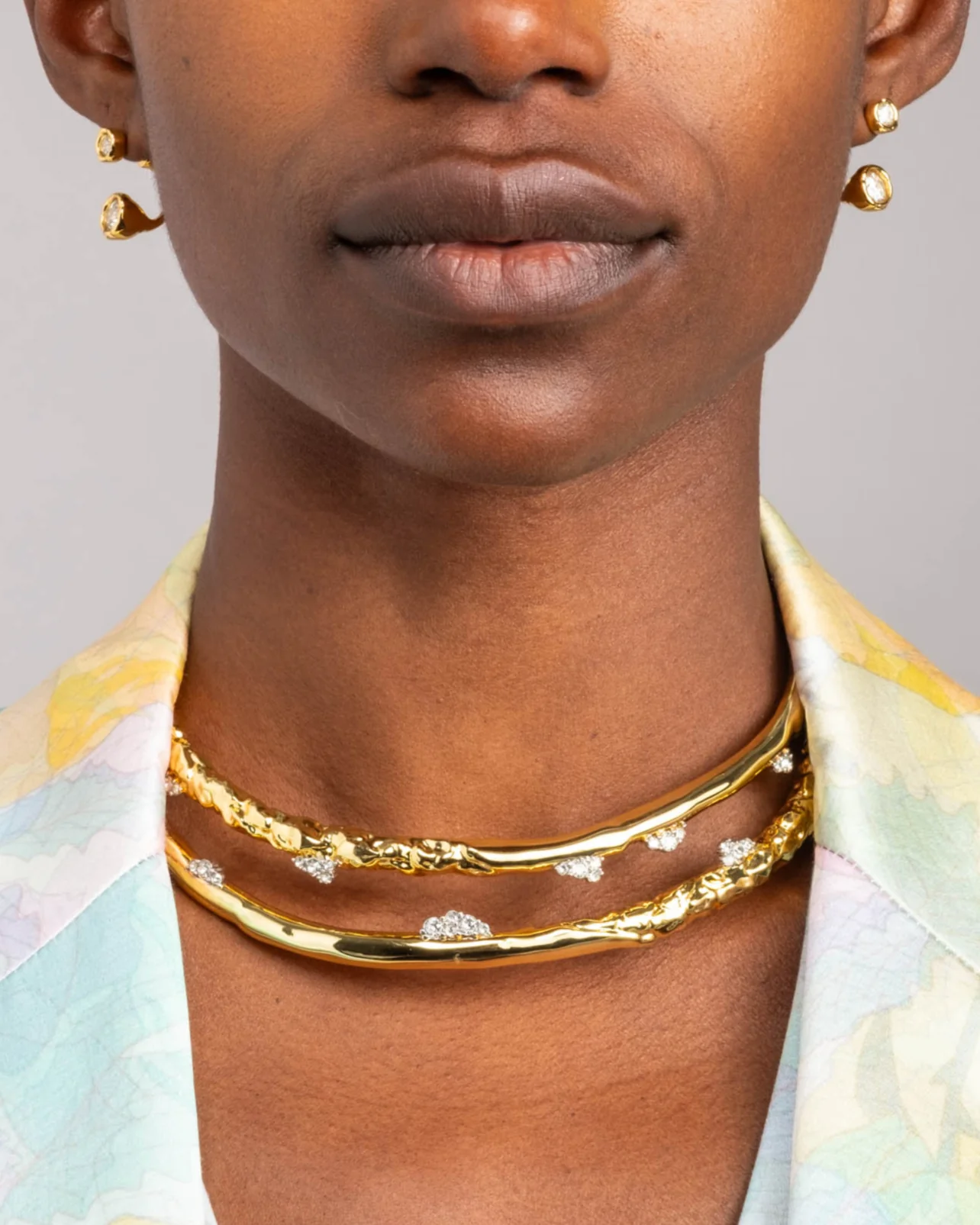 Textural 14k gold plated collar necklace with an open tiered silhouette, encrusted with offset clusters of crystals in silver tone plated settings, for an opulent Brutalist inspired juxtaposition and added dimension.