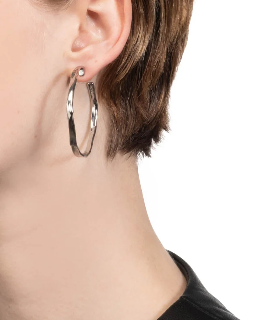 Reflecting light from every ripple, these high-shine molten silver tone plated hoops have a signature liquid ribbon silhouette. Sold as a pair.