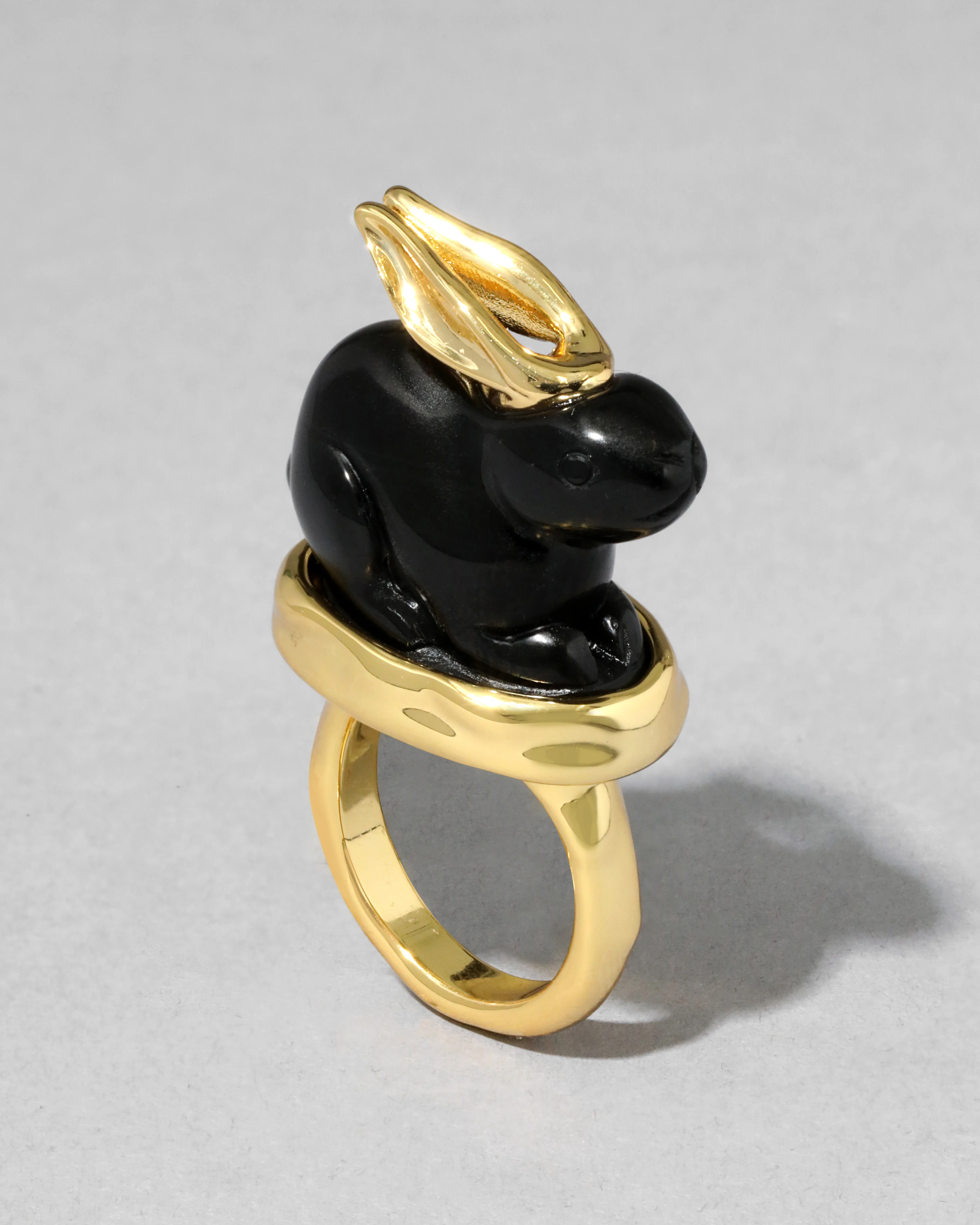 Polished obsidian stone is hand-sculpted into the whimsical silhouette of a resting bunny rabbit, with golden accented ears and perched atop the 14k gold plated pedestal band of this fantastical cocktail ring.