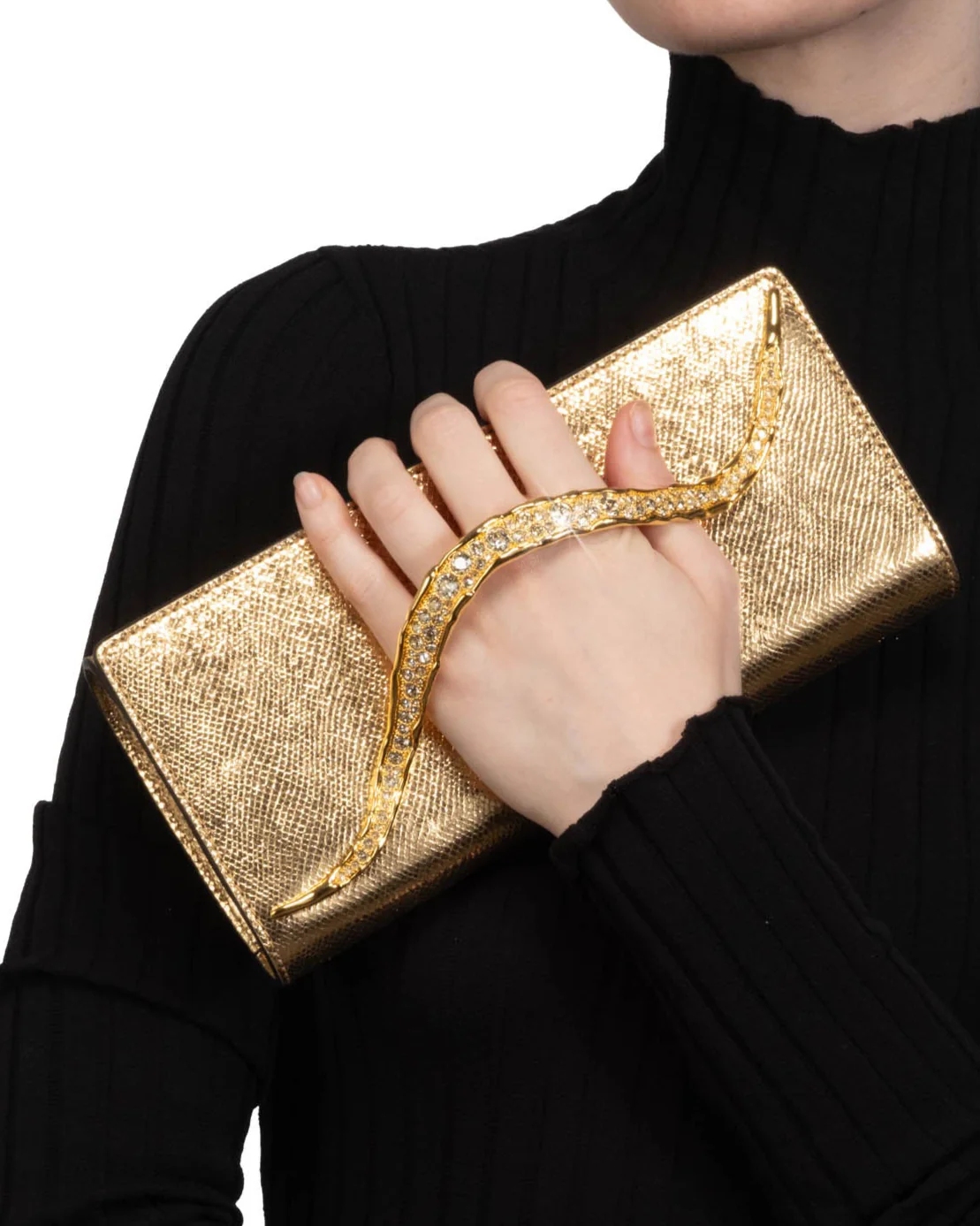 The Crystal Curve Clutch has sinuous 14k gold plated crystal pavé hardware that cascades across the front and is perfectly crafted for your hand to glide through and hold. The structured metallic gold silhouette is composed of genuine leather with a special metallic foil finish creating a snakeskin inspired texture.