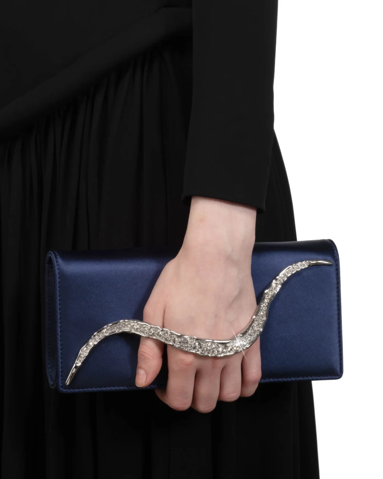 This seasons Crystal Curve Clutch has sculptural silver tone plated crystal pavé hardware that cascades across the front and is perfectly crafted for your hand to glide through and hold. The structured Royal Navy silhouette is composed of recycled satin making it completely vegan.