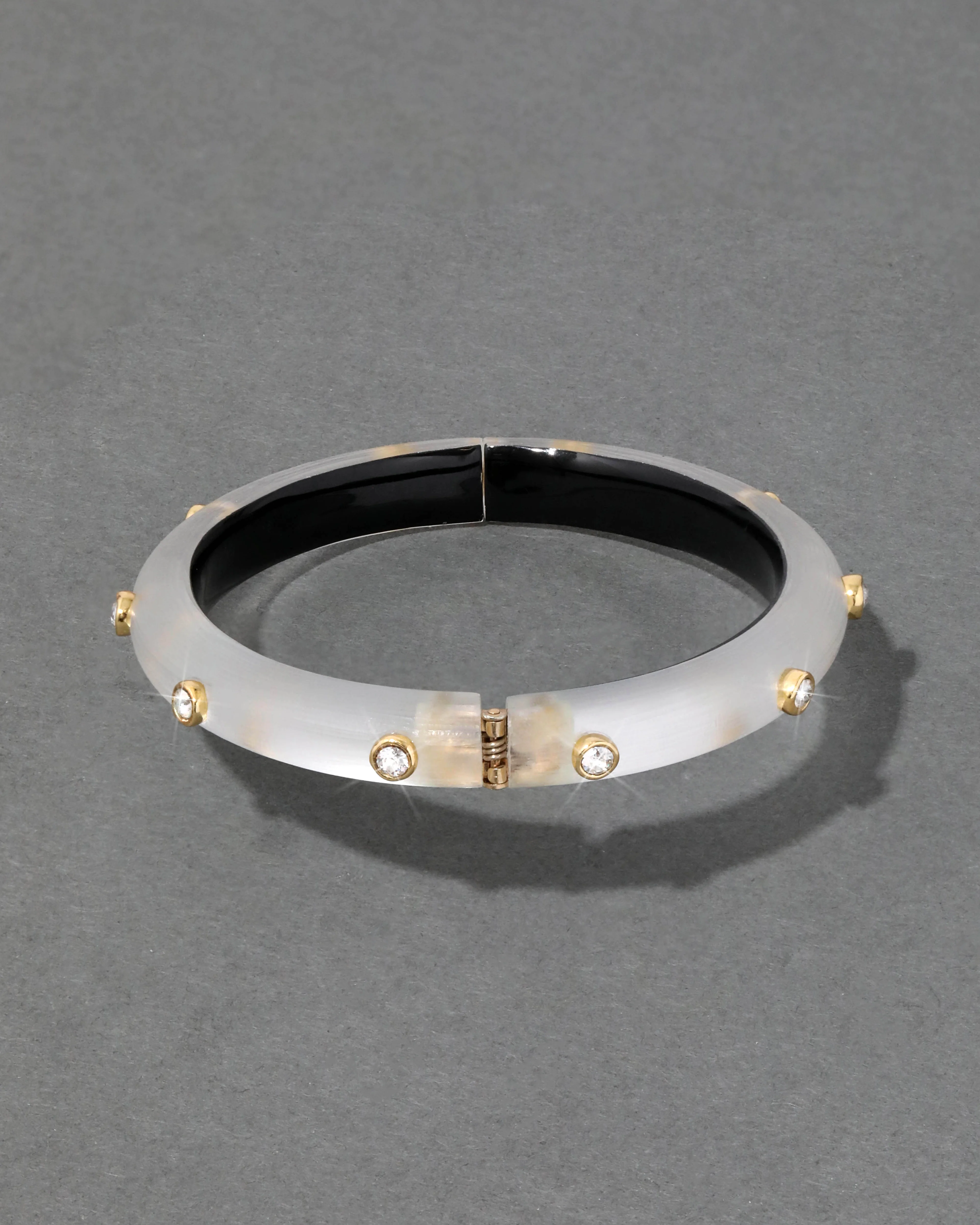 14k gold plated custom molten bezel set crystals accent this hand-painted and hand-carved Lucite hinge bracelet. A strong presence as a single or perfect in a stack.