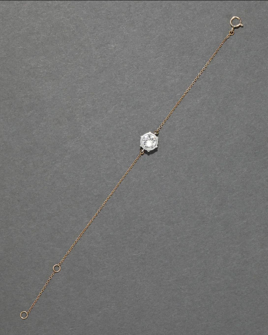 A single round cut luminous crystal set in sterling silver is held by a thin 14k gold chain on this delicate bracelet that can be worn solo or in a stack.