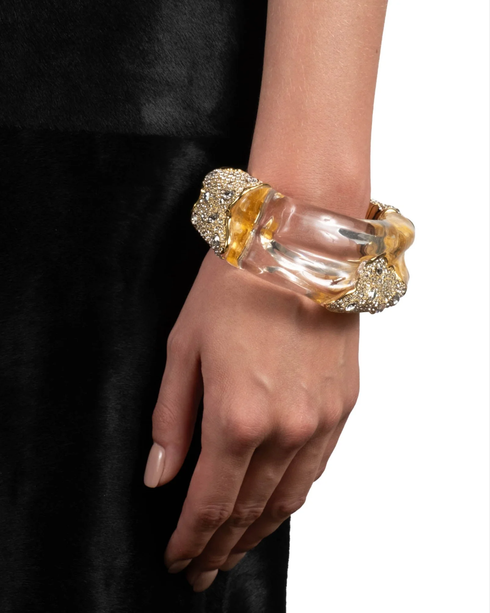 Pavé crystal accented 14k gold plated metalwork oozes over this hand-sculpted liquid clear Lucite hinged bracelet, in an organic shape that evokes natural geodes. A tapered silhouette highlights the wrist and reflects light from every angle.