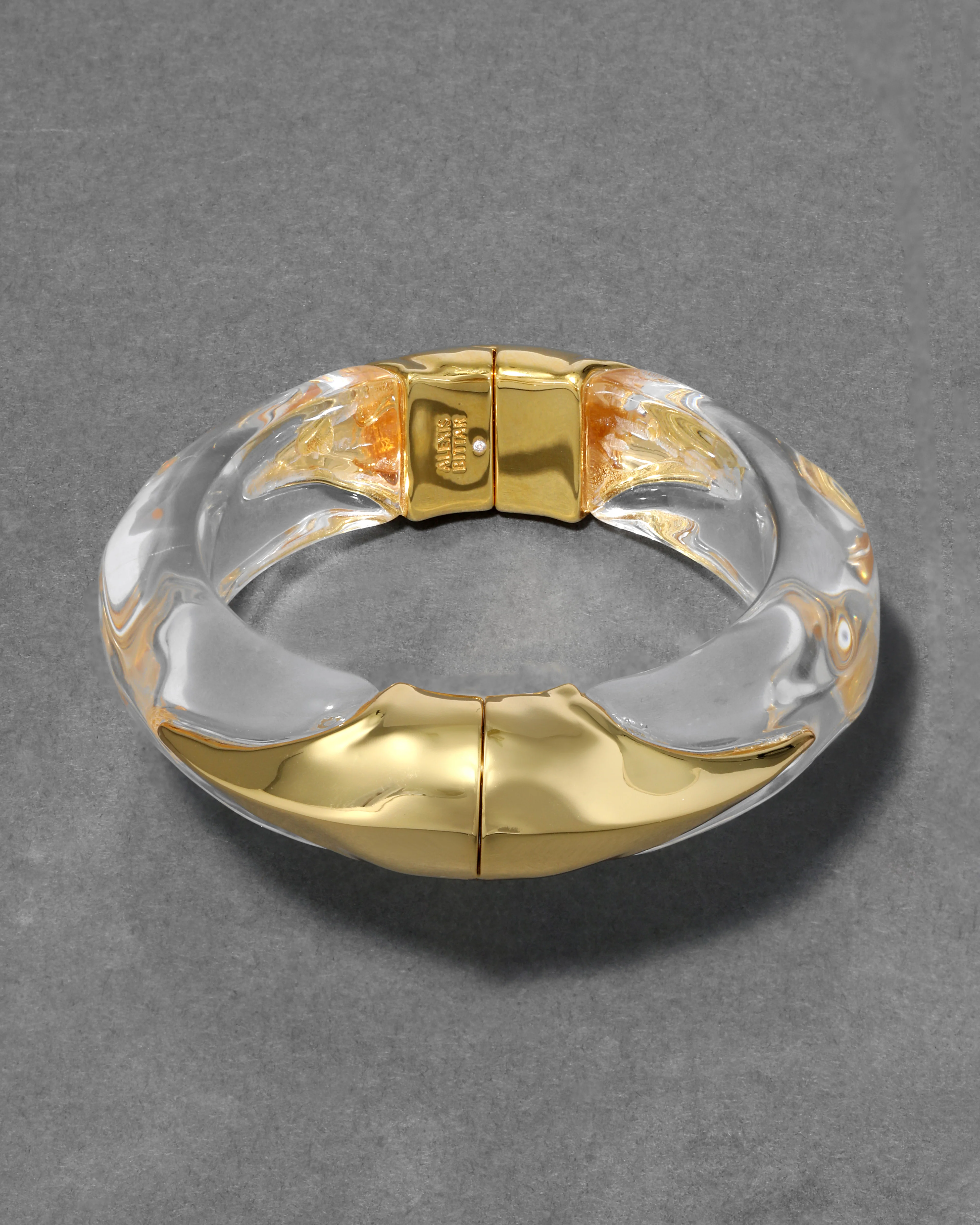 Molten 14k gold plated metalwork claws onto the hand-sculpted Lucite silhouette of this striking sculptural hinge bracelet, hand polished for a watery liquid clear reflective glow.