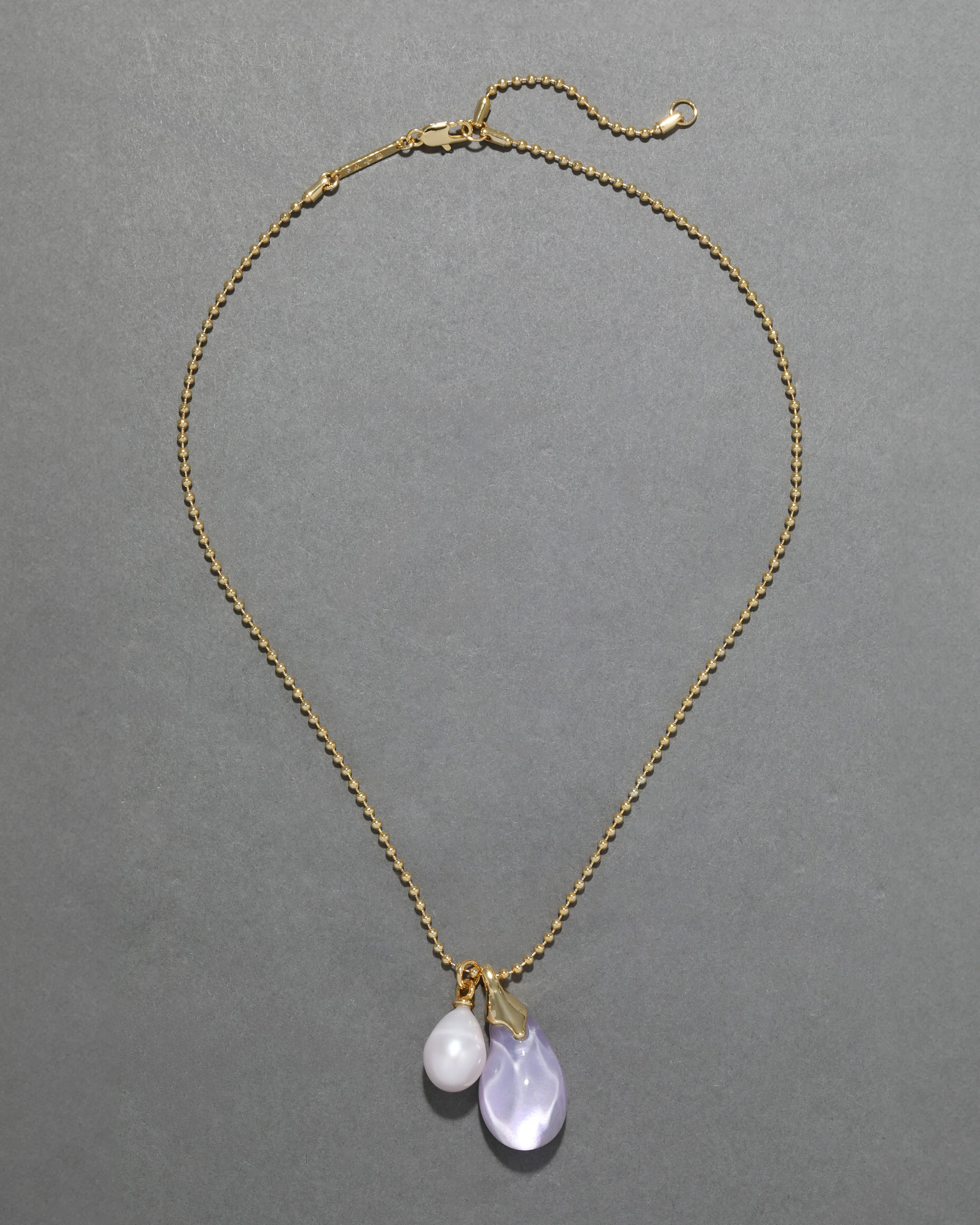 A lustrous freshwater pearl is paired with a vibrant hand-sculpted Lucite dewdrop pendant, capped with molten 14k gold plated metalwork, on this versatile 14k gold plated ball chain necklace that adds a pop of color and playful elegance to any look.