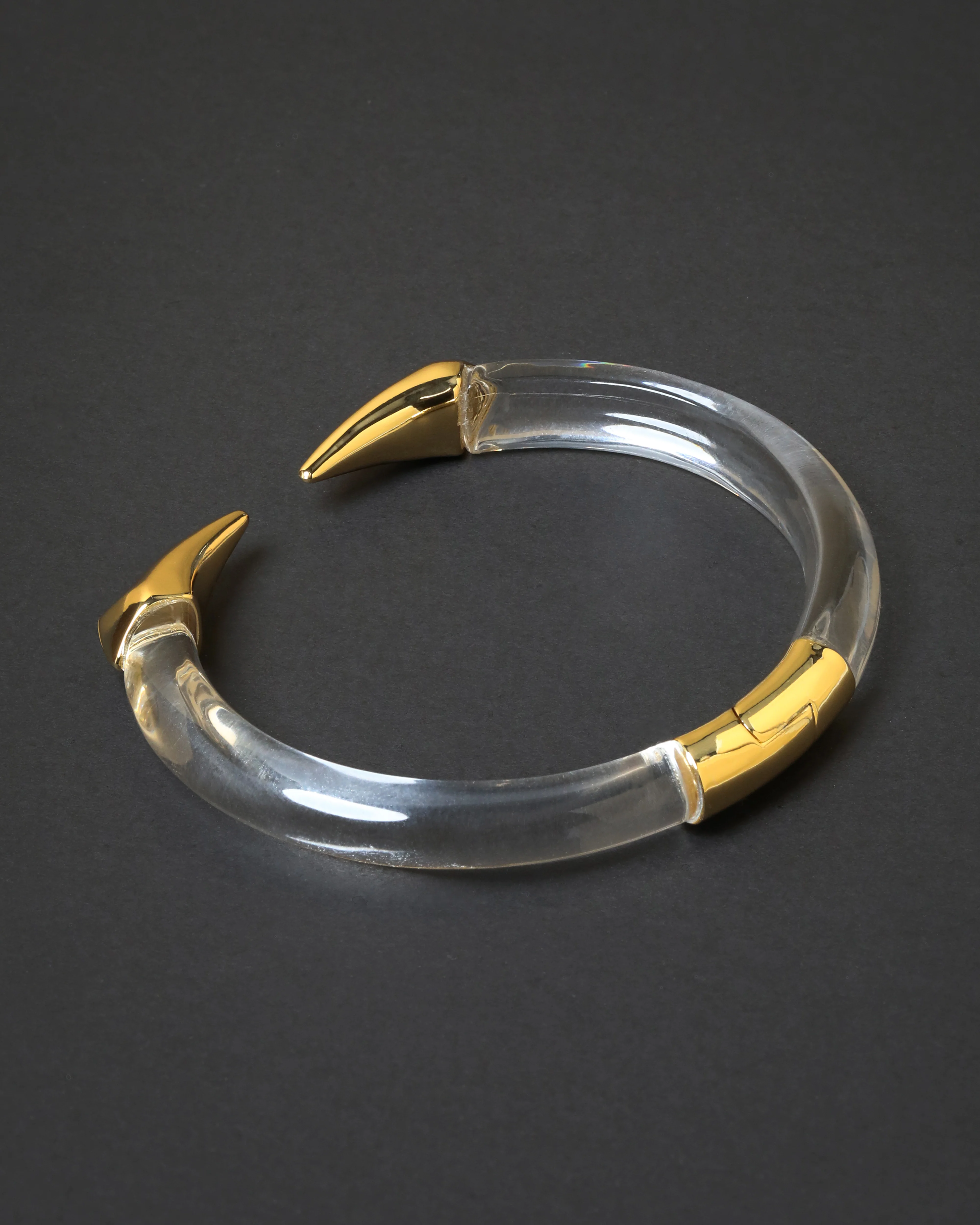 Hand-carved and hand-painted Lucite hinge bracelet with 14k gold plated tapered spear tips. Combines edge, color and luminosity - a rare combo. Can stand alone or be perfect for stacking.- Lucite with 14k gold plated metalwork