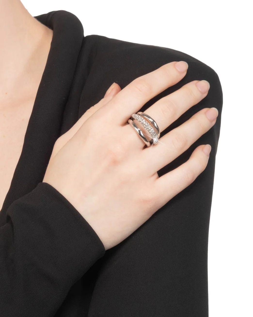 Bands of high-shine silver tone plated brass and brilliant micro pavé crystal give the illusion of stacked rings with negative space on this sculptural orbiting ring.