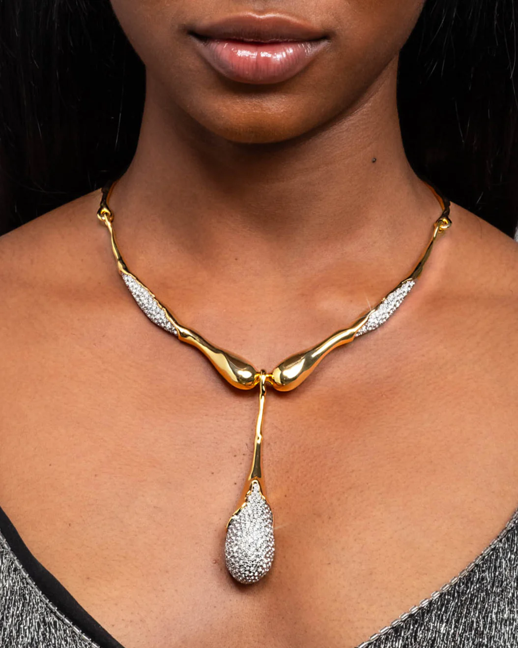 Molten 14k gold plated metalwork accented with delicate pavé crystals cascade along the neckline, to an oversize teardrop hinge for movement. Forming this editorial collar necklace with captivating sculptural elegance.