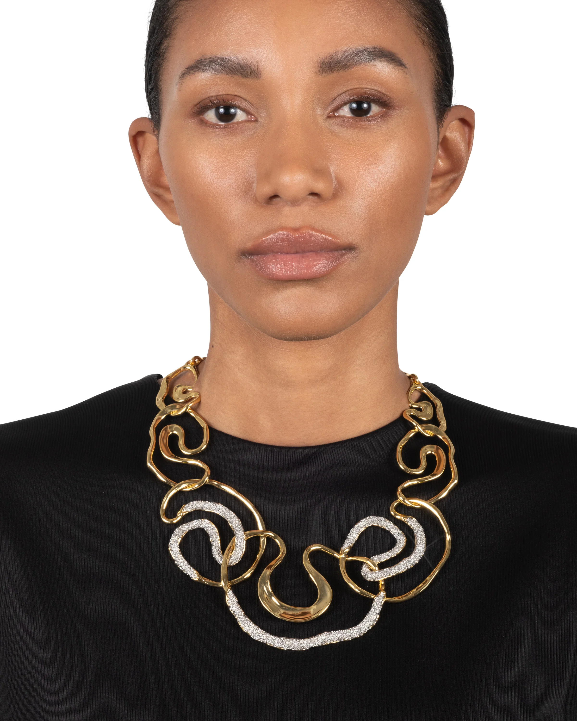Created by continuous line work of graduating thickness, molten 14k gold plated metalwork melds into delicate pavé crystal in rhodium tone plated settings. Intertwining & linking to highlight every curve and form this truly unique and sculptural collar necklace.