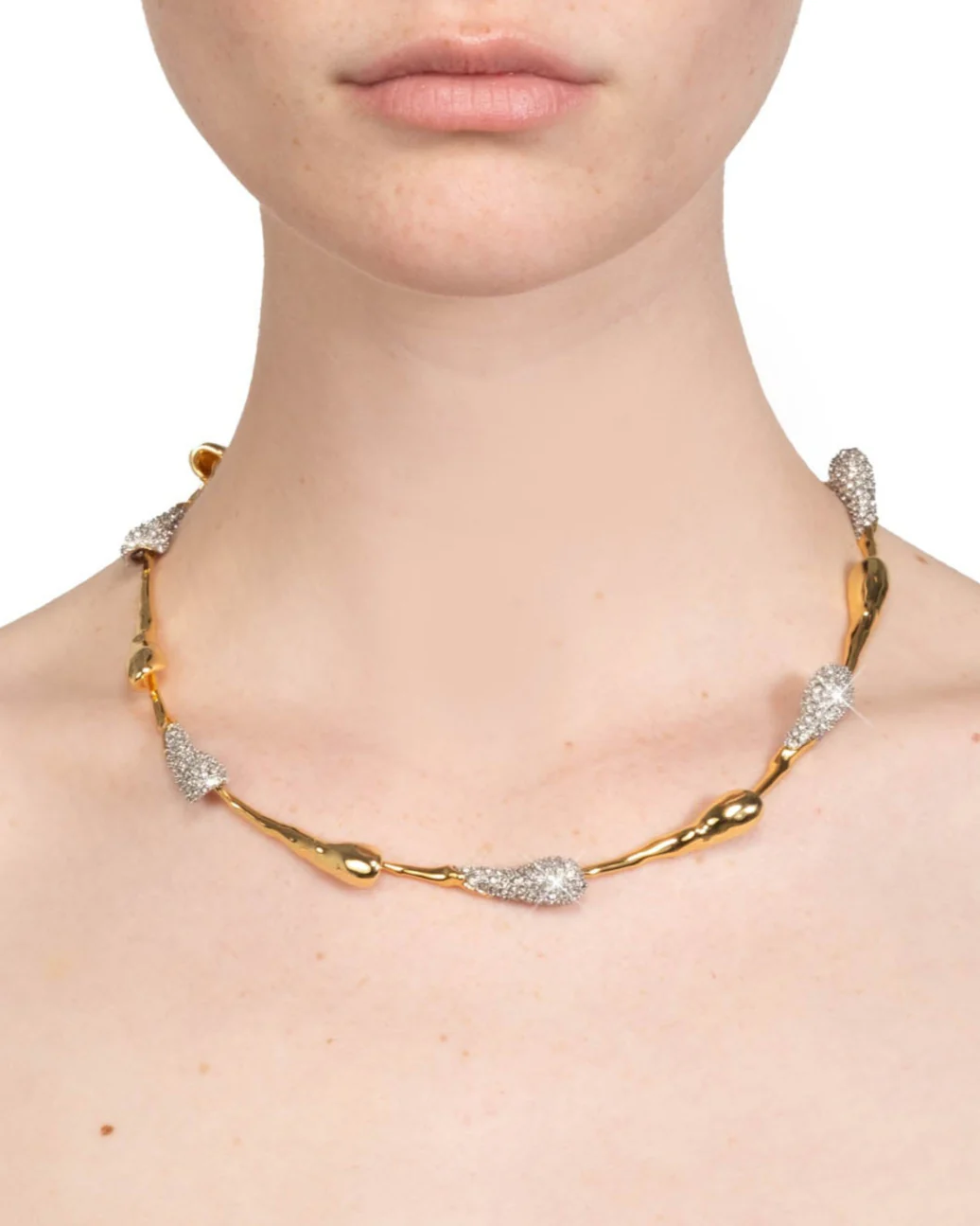 Molten 14k gold plated dewdrops orbit the neckline from this striking articulated sculptural collar necklace, with glistening crystal pavé in silver tone plated settings. Evoking vintage elegance with a future-forward silhouette.