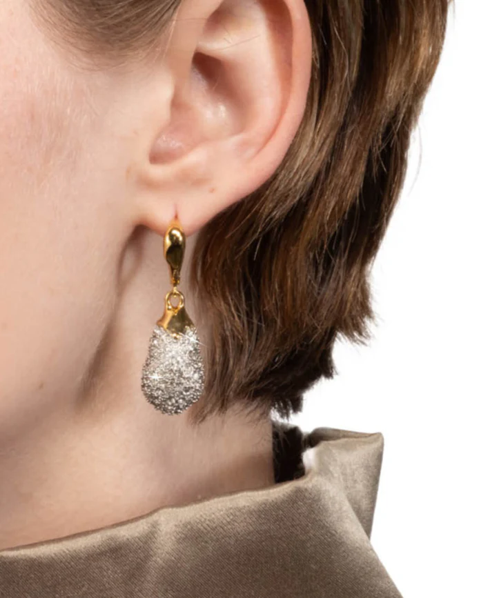 Molten 14k gold plated metalwork oozes over glistening crystal pavé, in textural silver tone plated settings, on these vintage inspired teardrop leverback earrings that shimmers with every step.