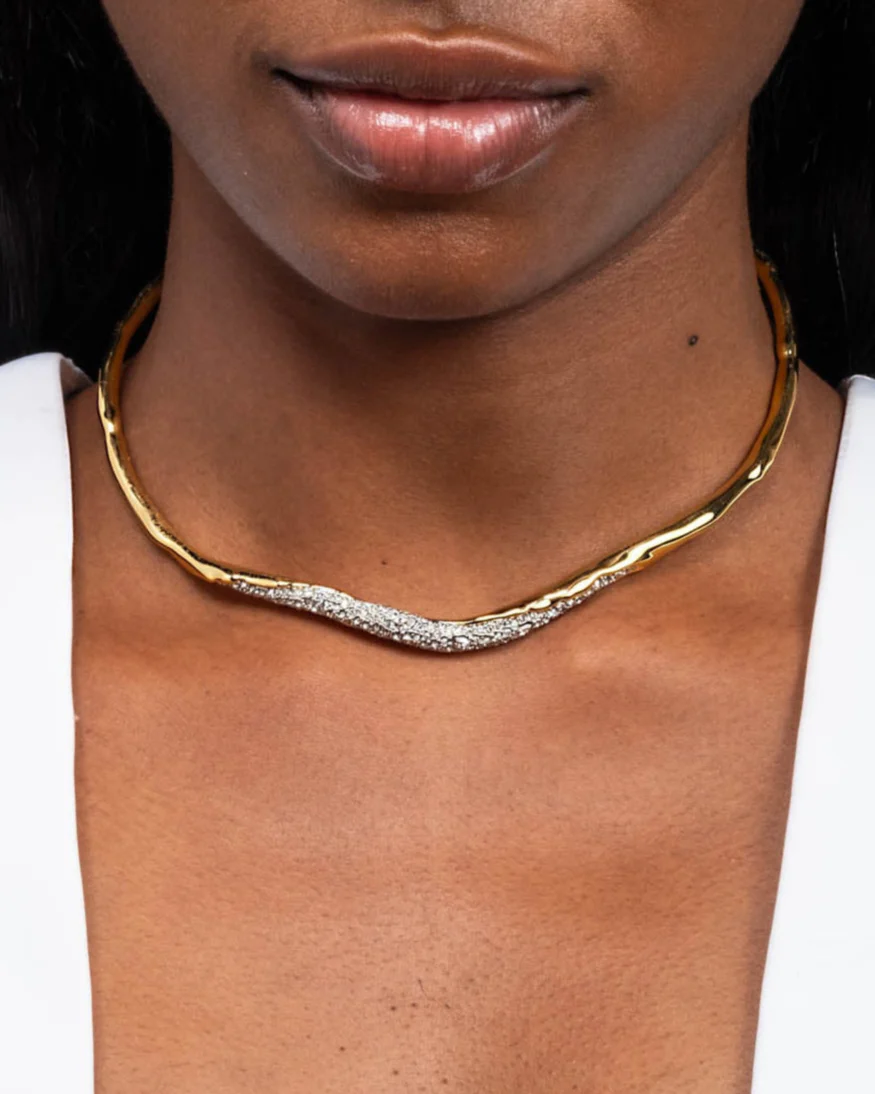 An update to our best-selling thin collar necklace, this new iteration is crafted in molten 14k gold plated metalwork and finished with micro pavé crystal set in silver tone plated metalwork. The silhouette is sculpted to create a ripple of motion across the neckline.