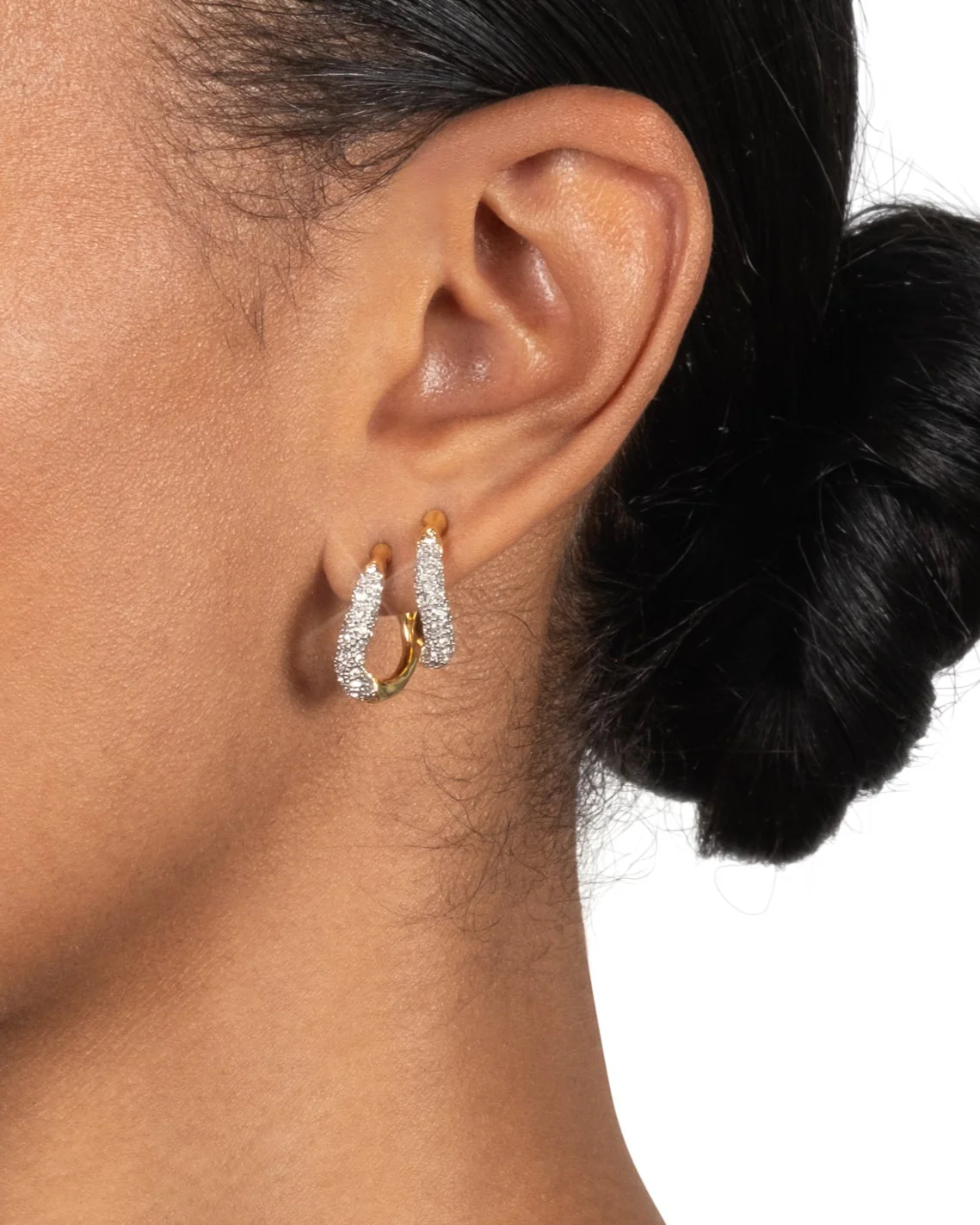 Petite 14k gold plated hoop earrings with a twisted silhouette of gleaming organic metalwork that oozes over silver tone plated textural crystal pavé. Sold as a pair.