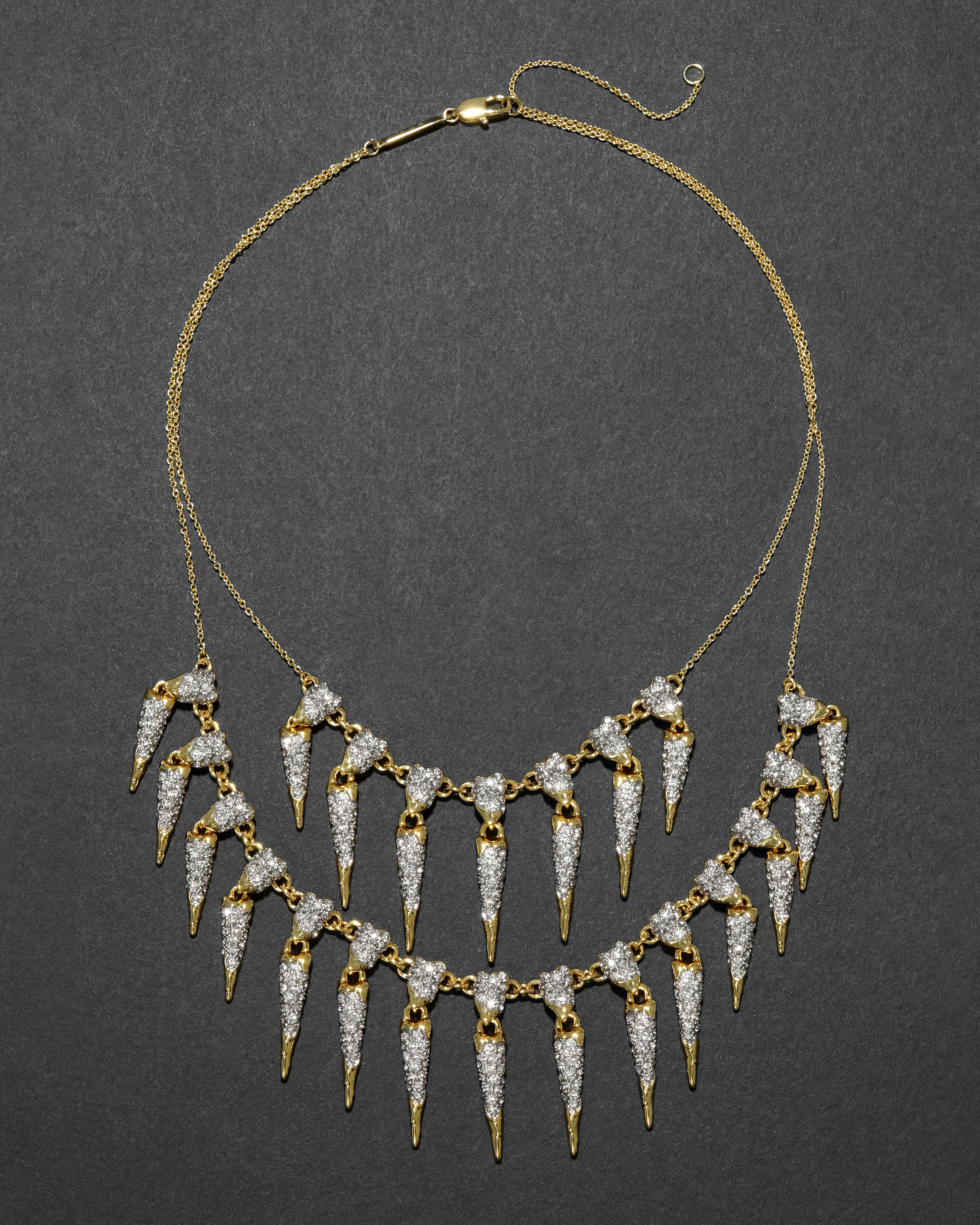 A double row of crystal pavé encrusted silver tone plated spears, with contrasting 14k gold plated tips, hang with articulated movement on this 14k gold plated layered necklace.
