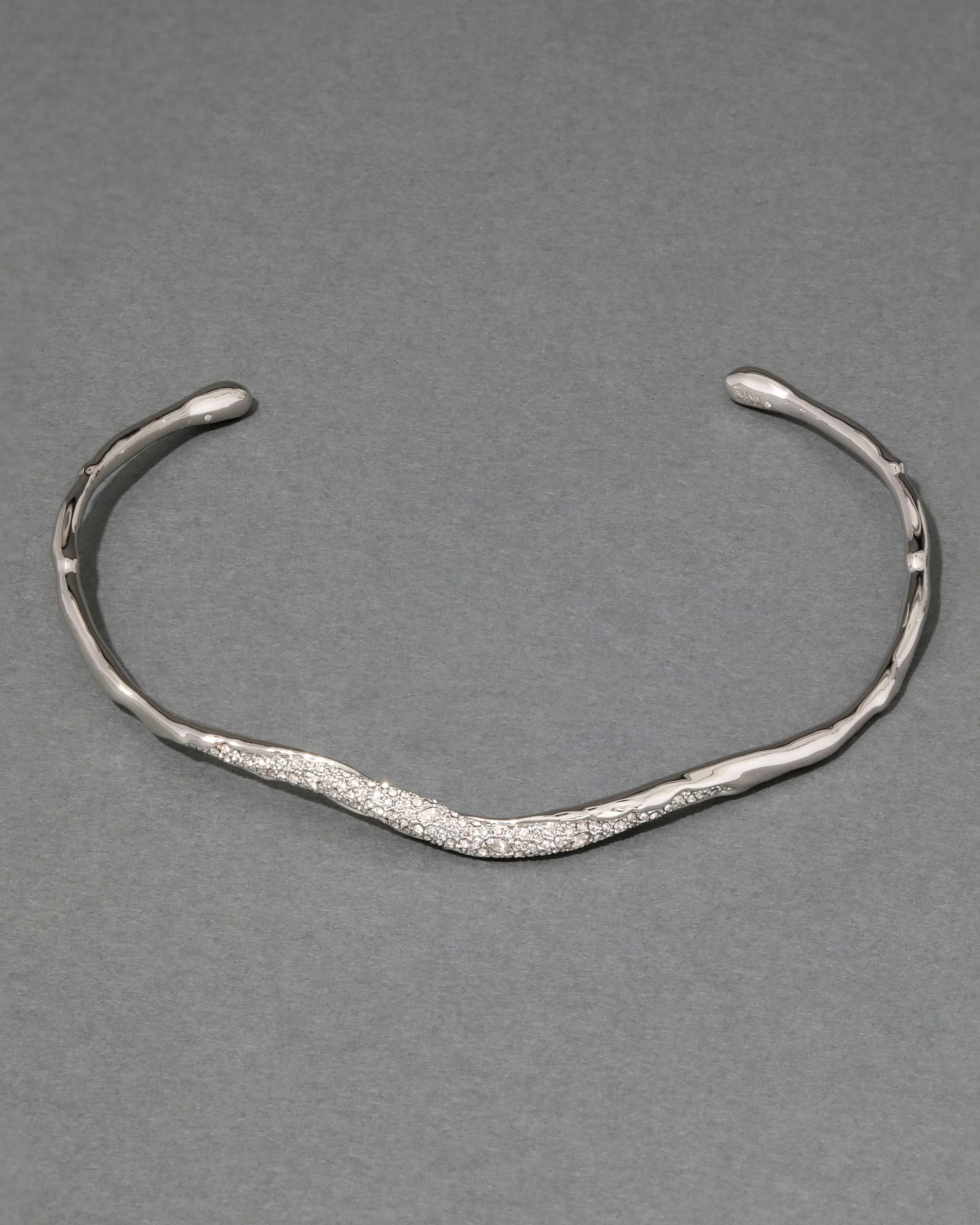 An update to our best-selling thin collar necklace, this new iteration is crafted in molten high-shine silver tone plated metalwork and finished with hand-set micro pavé crystal. The silhouette is sculpted to create a ripple of motion across the neckline.