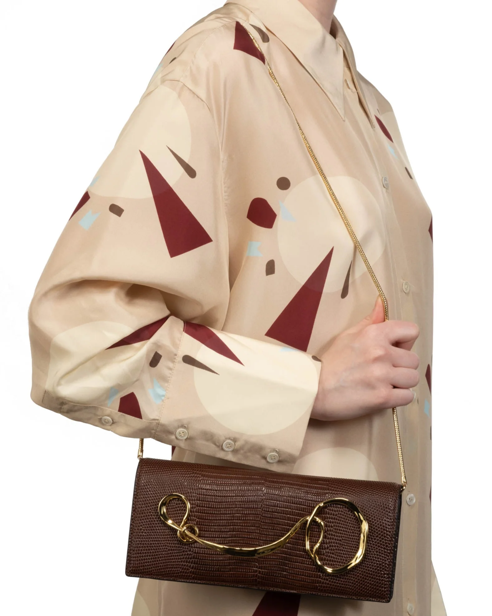 Using signature Alexis Bittar design ethos in its shapes and hardware, this structured clutch features a 14k gold plated twisted liquid link handle. The handle is perfectly crafted for your hand to glide through and hold. The richly hued chocolate embossed lizard leather is from Italy and has a slight sheen. Pigments are hand-applied, which makes each piece unique.